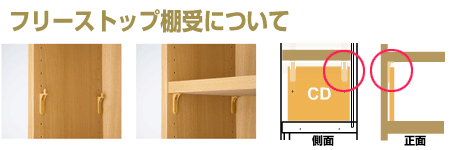 フリーストップ棚受は、耐久性、安全性にすぐれた構造ですが、収納物に棚板を近づけるとフリーストップ棚受が収納物に干渉します。 それを避けるためには、上部に余裕を持って設置することをおすすめします。